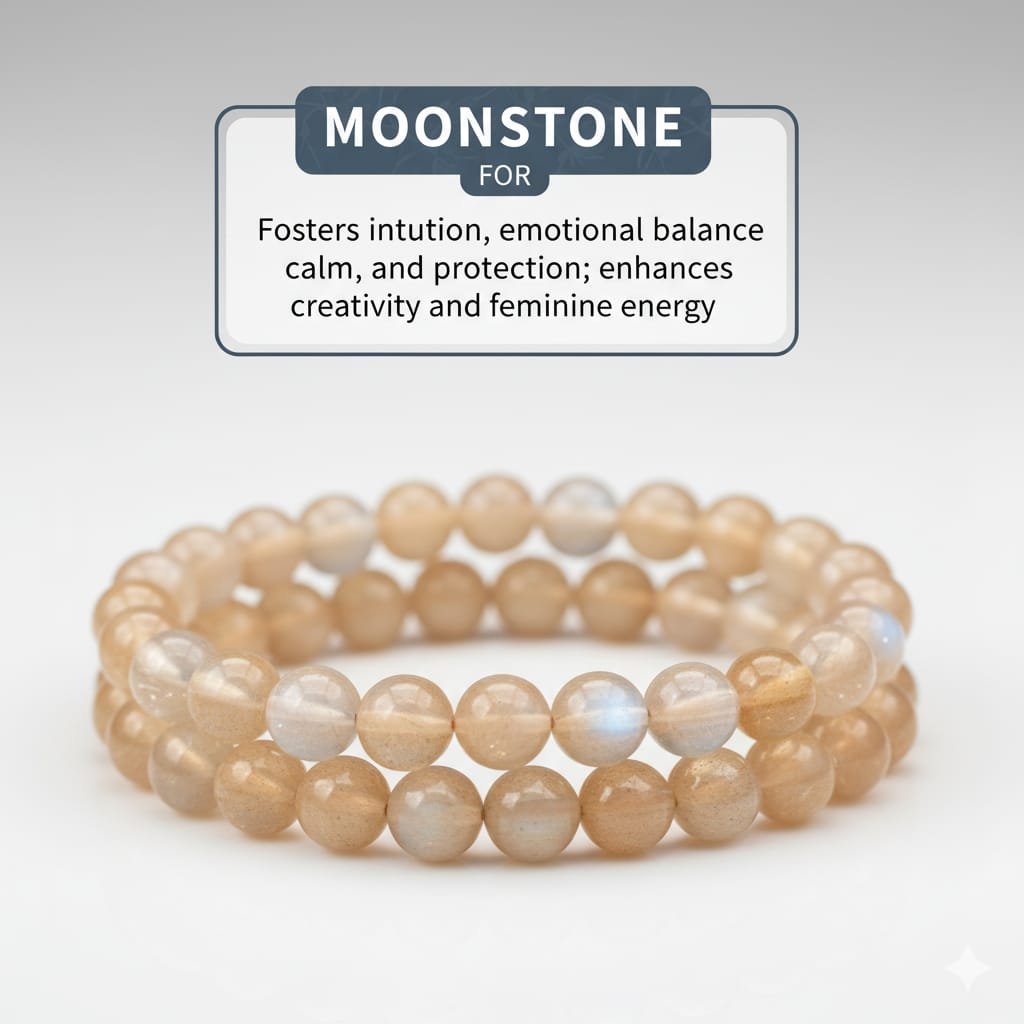 Moonstone bracelet intuition aur emotional balance ke liye ideal hai. Iske iridescent beads feminine energy ko activate karte hain aur creativity ko enhance karte hain. Perfect for artists, healers, and spiritual practitioners.