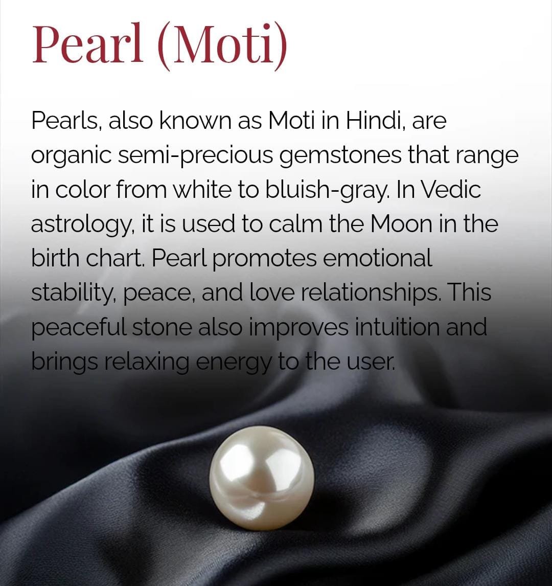 Pearl, yaani Moti, ek organic gemstone hai jo Moon se associated hota hai. Vedic astrology ke mutabiq, ye stone emotional balance, peace aur love relationships ko nurture karta hai. Iske soft glow aur soothing energy wearer ko calm aur centered banate hain. Ideal for those seeking emotional healing and inner harmony.