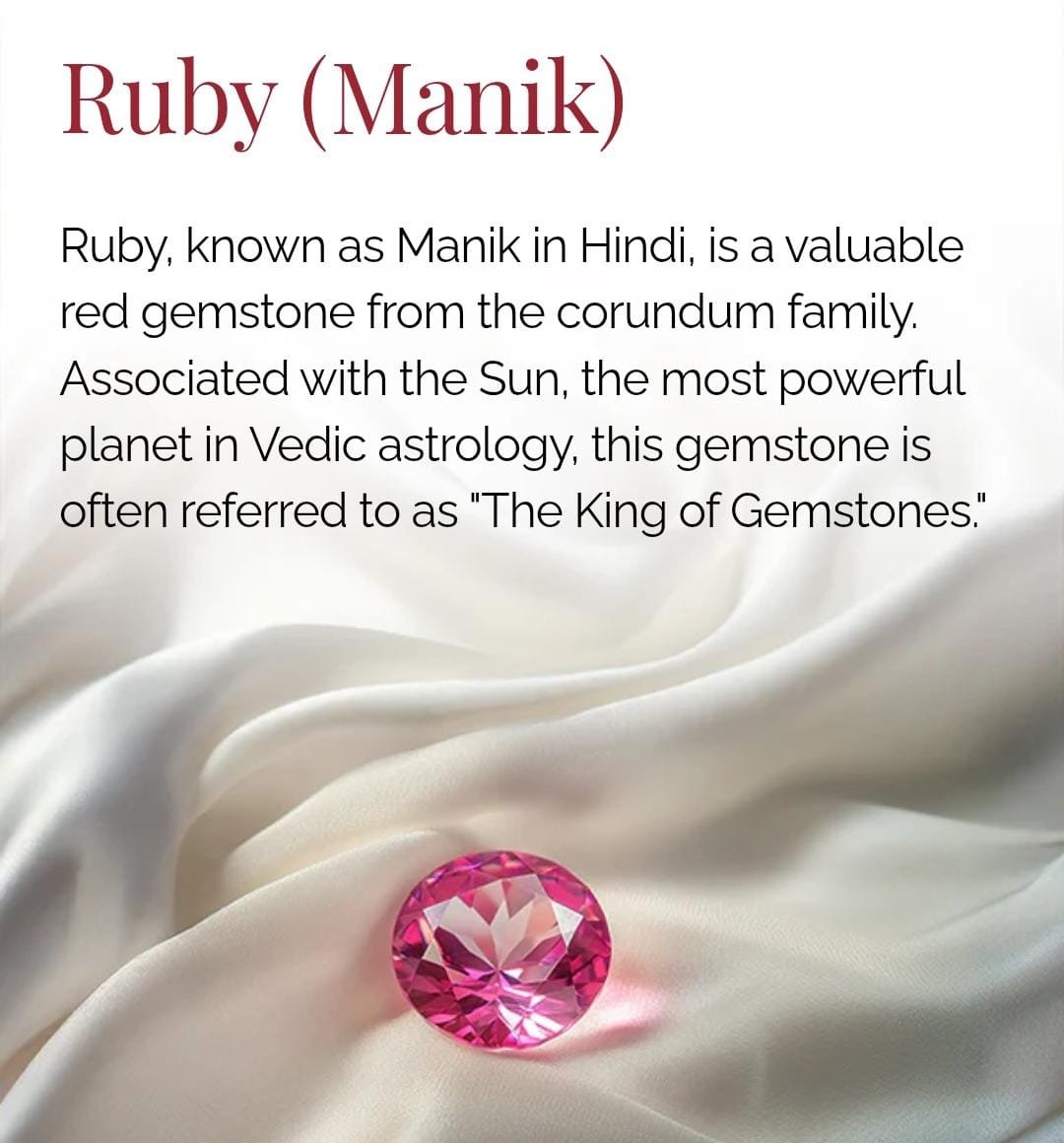 Ruby, ya Manik, “King of Gemstones” ke naam se jaana jaata hai. Ye Sun se associated hota hai aur confidence, charisma aur success ko amplify karta hai. Iske vibrant red tones wearer ko radiant banate hain—perfect for those in public roles, creative fields, or leadership positions.