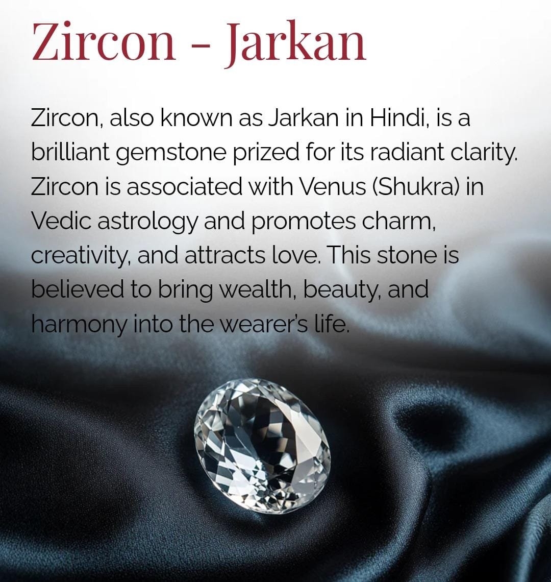 Zircon, ya Jarkan, ek brilliant gemstone hai jo Venus (Shukra) se linked hota hai. Ye stone radiant clarity ke saath charm, creativity aur emotional warmth ko amplify karta hai. Ideal for artists, lovers, and those seeking elegance and abundance in life.